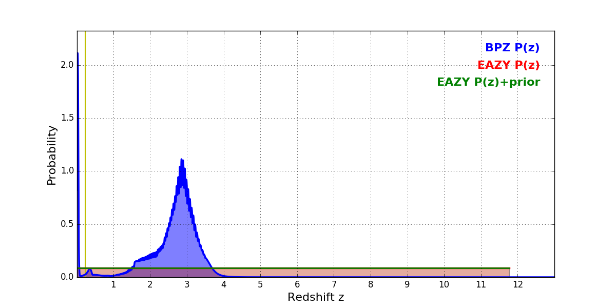 In P(z) plots: Yellow lines mark the cluster redshift z = 0.228,