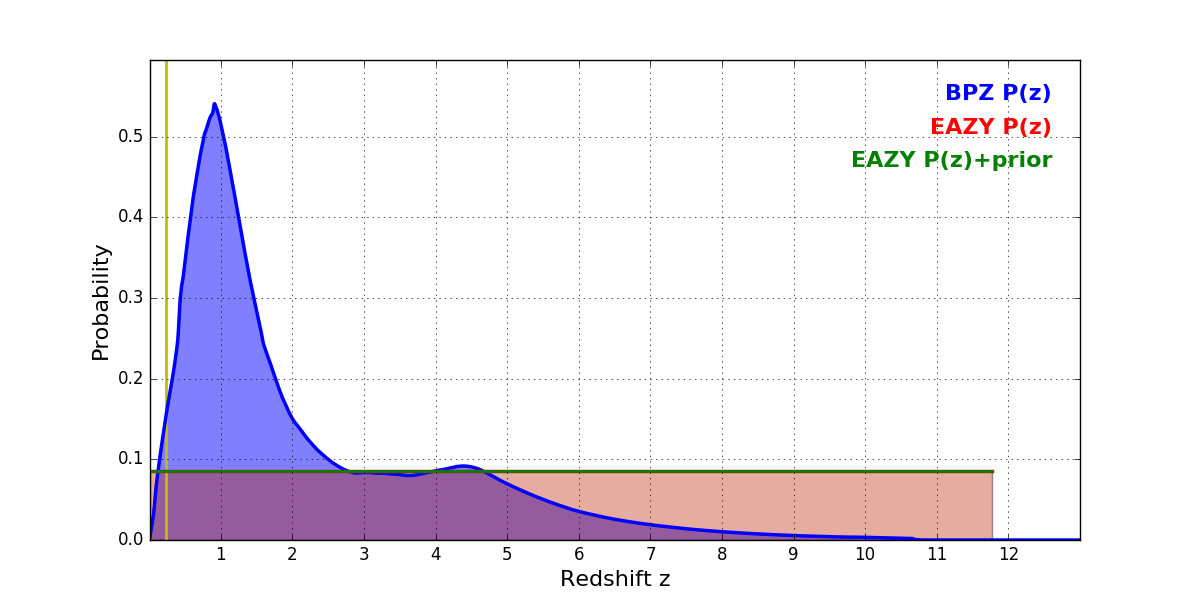 In P(z) plots: Yellow lines mark the cluster redshift z = 0.228,