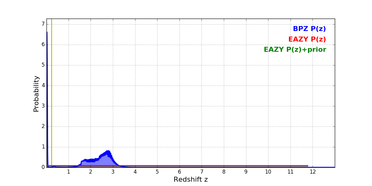 In P(z) plots: Yellow lines mark the cluster redshift z = 0.228,