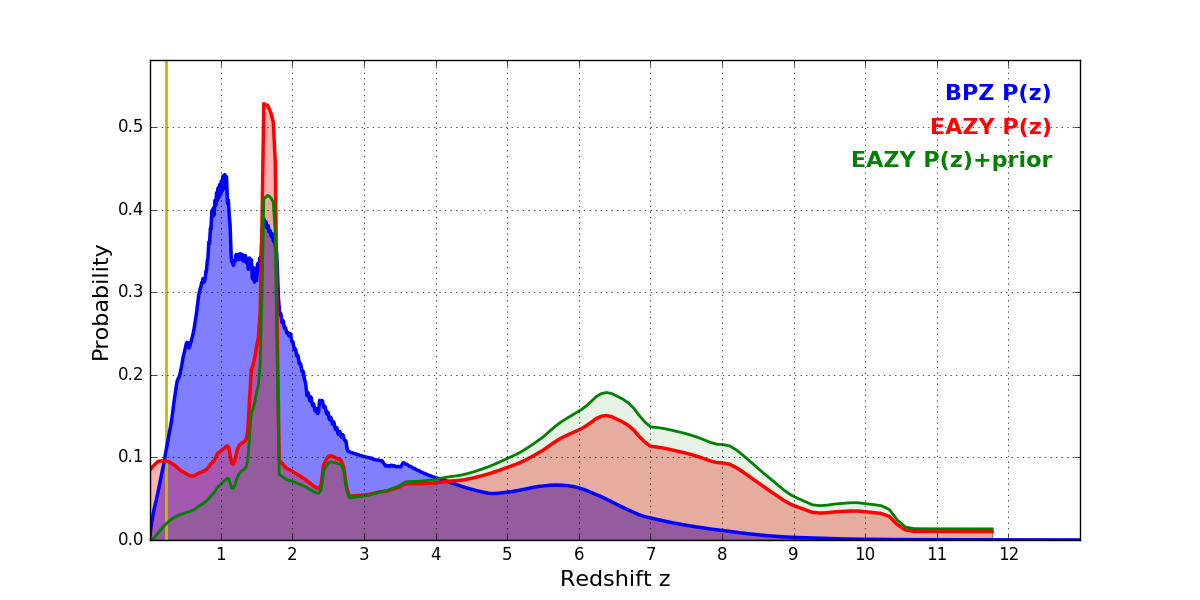 In P(z) plots: Yellow lines mark the cluster redshift z = 0.228,