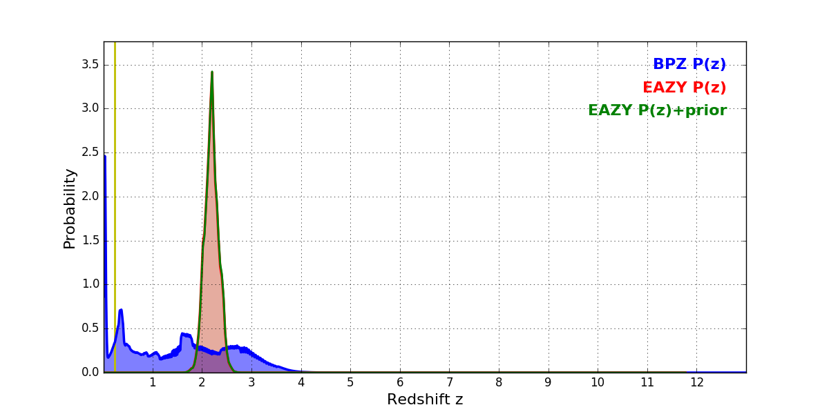 In P(z) plots: Yellow lines mark the cluster redshift z = 0.228,