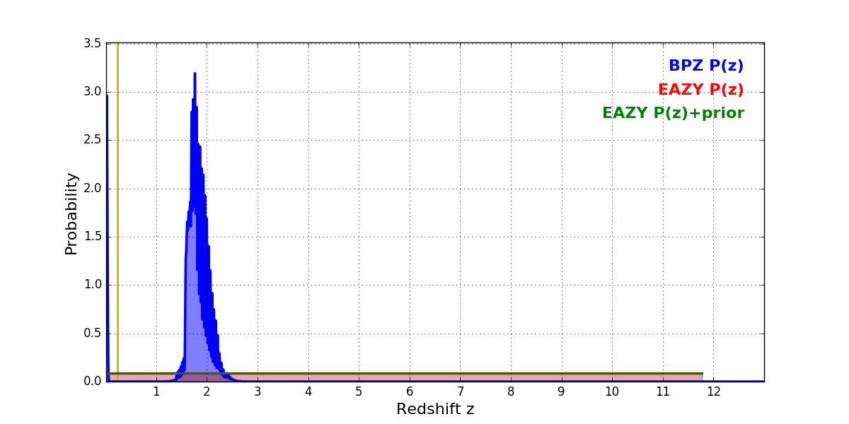 In P(z) plots: Yellow lines mark the cluster redshift z = 0.228,