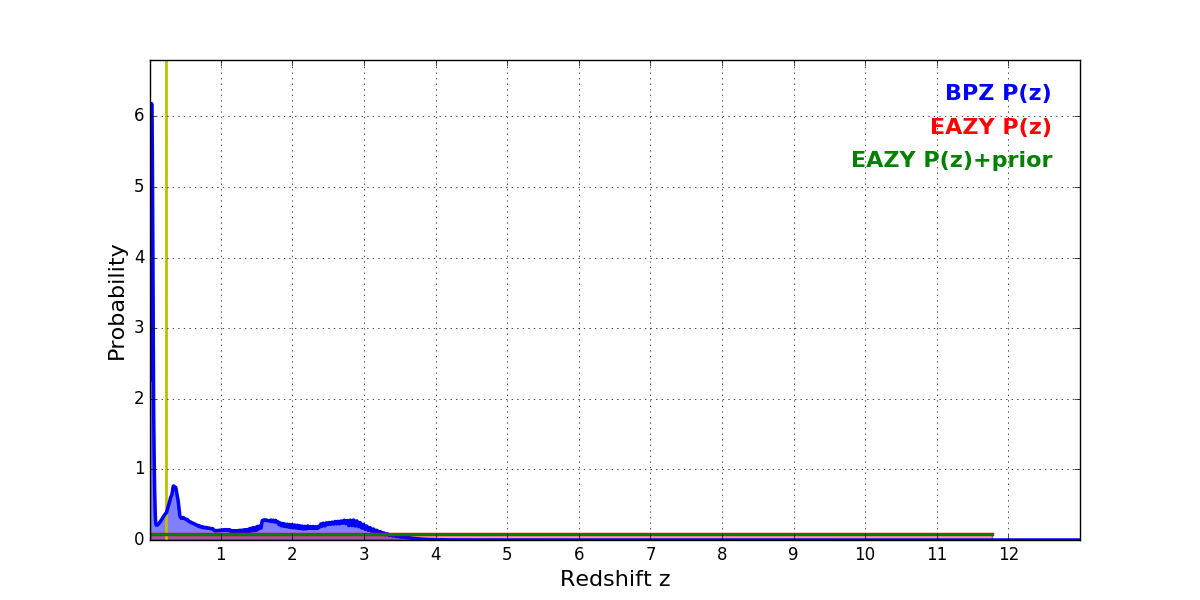 In P(z) plots: Yellow lines mark the cluster redshift z = 0.228,