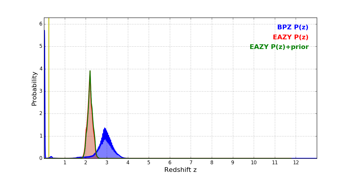 In P(z) plots: Yellow lines mark the cluster redshift z = 0.228,