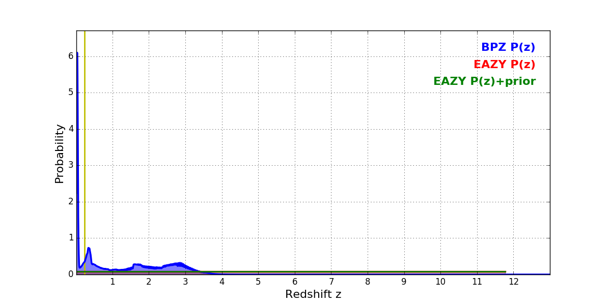 In P(z) plots: Yellow lines mark the cluster redshift z = 0.228,