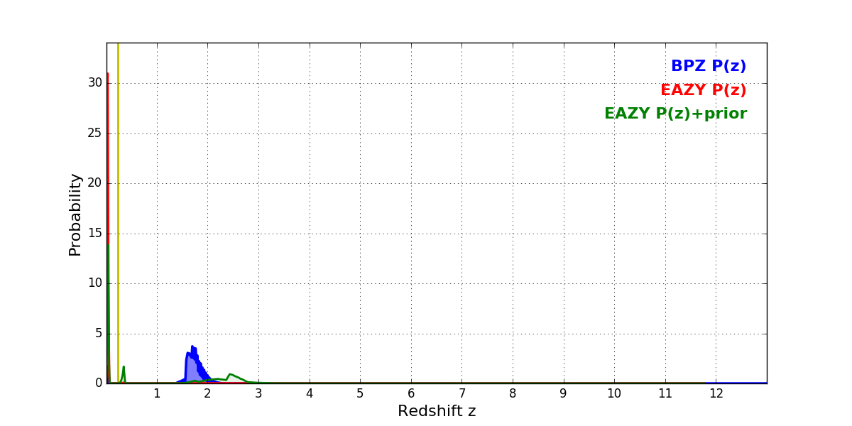 In P(z) plots: Yellow lines mark the cluster redshift z = 0.228,