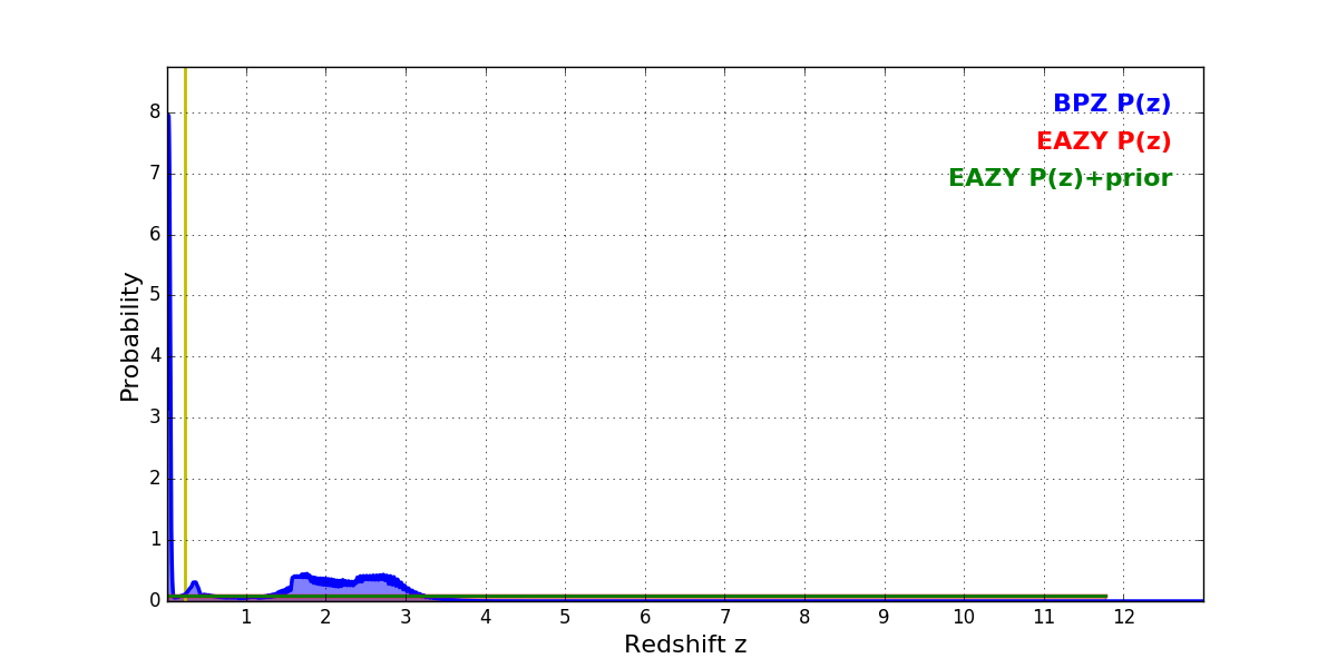 In P(z) plots: Yellow lines mark the cluster redshift z = 0.228,