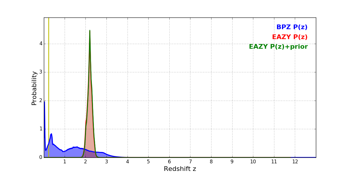 In P(z) plots: Yellow lines mark the cluster redshift z = 0.228,