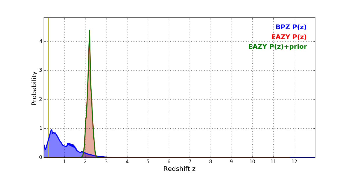 In P(z) plots: Yellow lines mark the cluster redshift z = 0.228,
