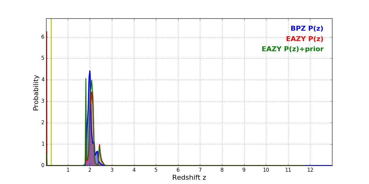 In P(z) plots: Yellow lines mark the cluster redshift z = 0.228,