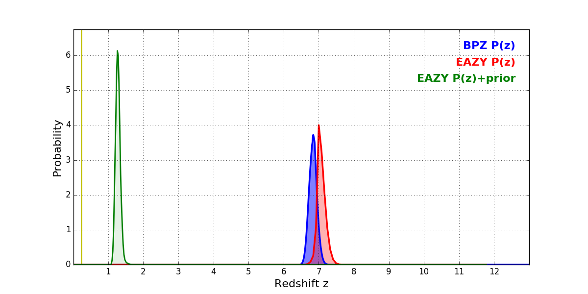 In P(z) plots: Yellow lines mark the cluster redshift z = 0.228,