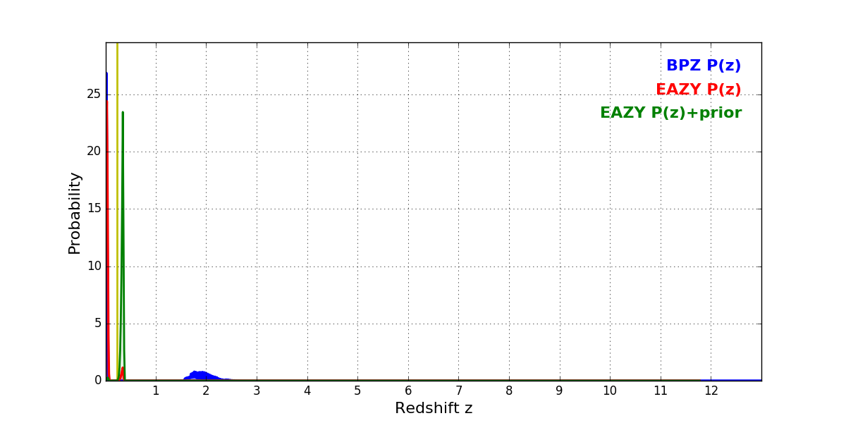 In P(z) plots: Yellow lines mark the cluster redshift z = 0.228,