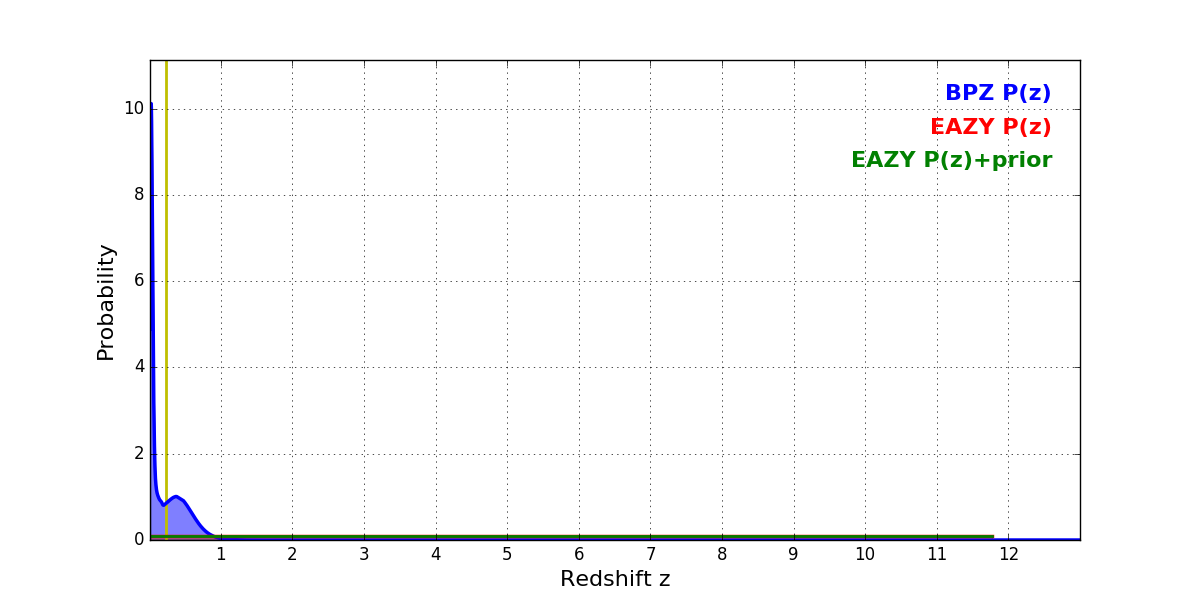In P(z) plots: Yellow lines mark the cluster redshift z = 0.228,