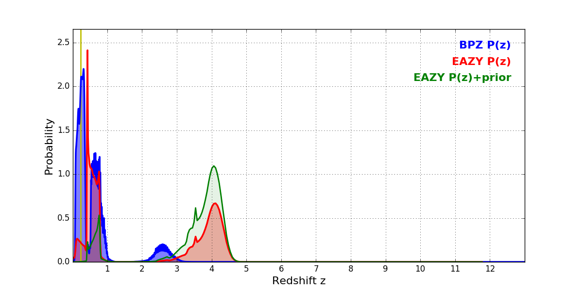 In P(z) plots: Yellow lines mark the cluster redshift z = 0.228,