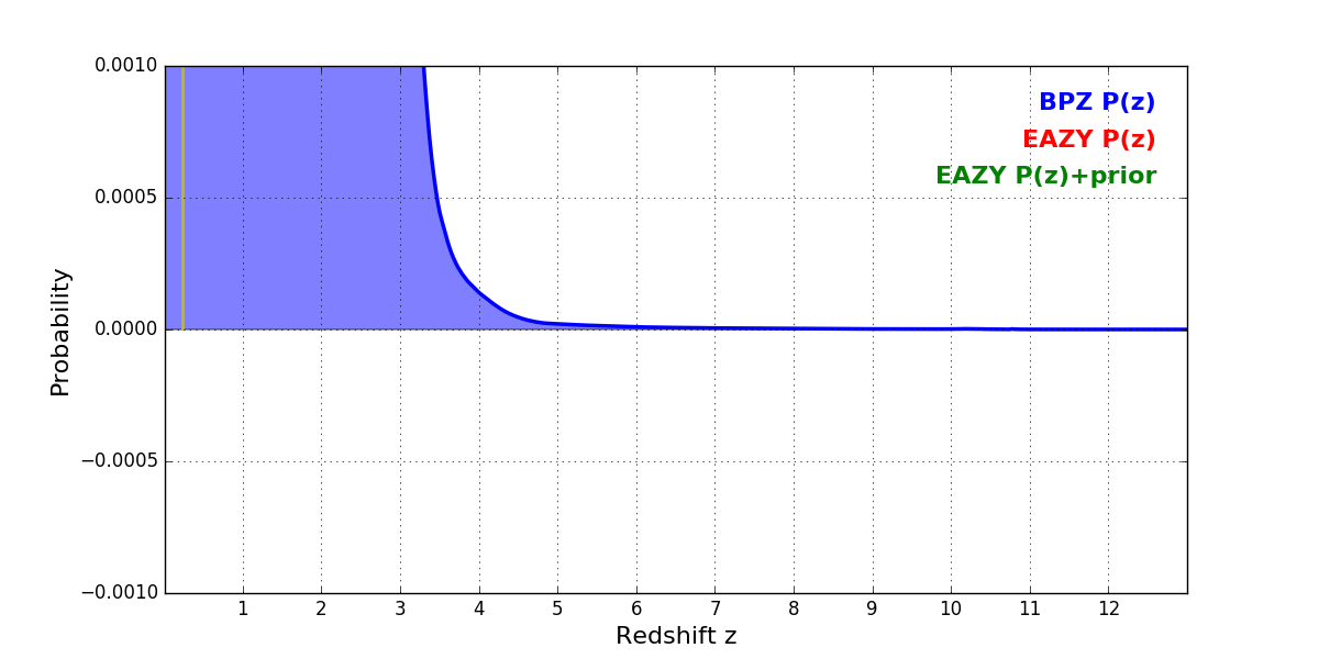 In P(z) plots: Yellow lines mark the cluster redshift z = 0.228,