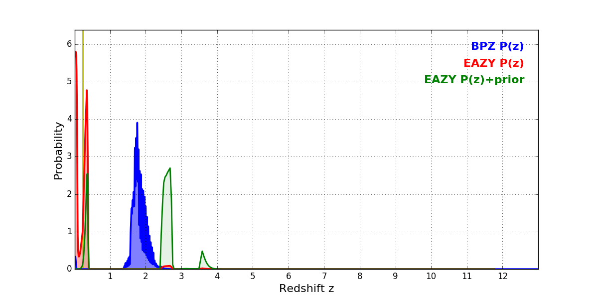 In P(z) plots: Yellow lines mark the cluster redshift z = 0.228,