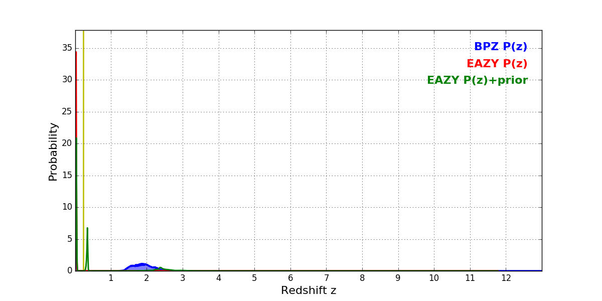 In P(z) plots: Yellow lines mark the cluster redshift z = 0.228,