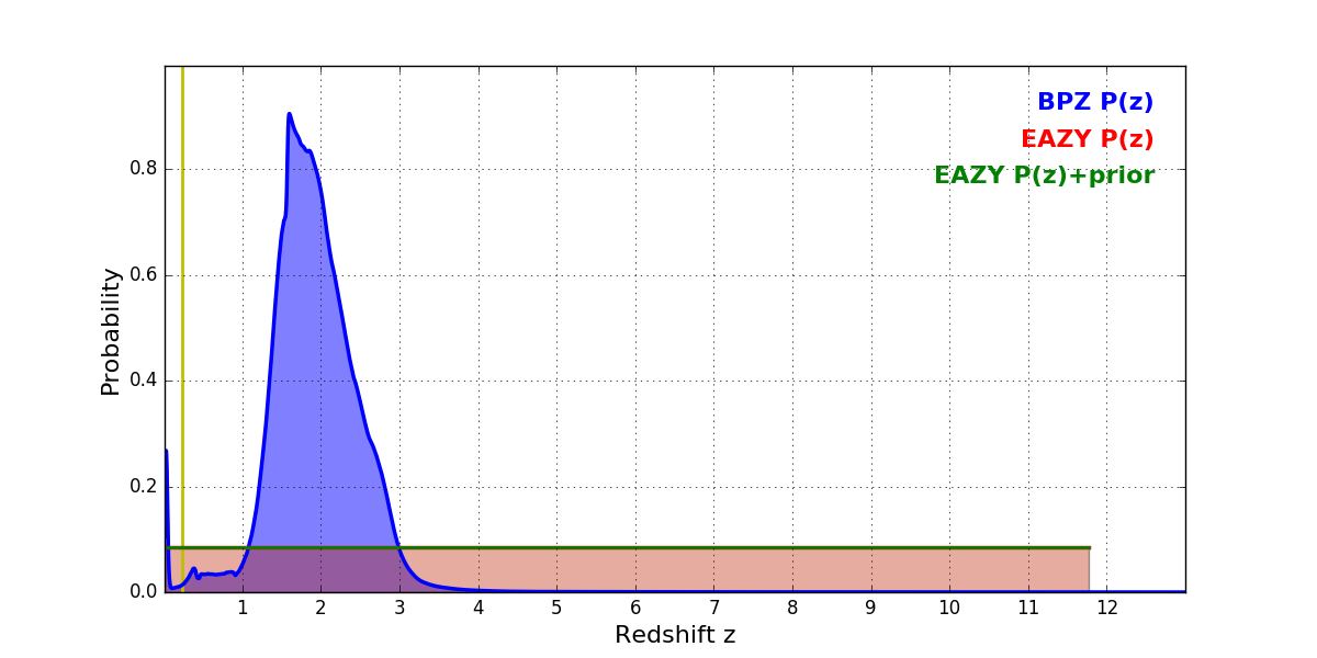 In P(z) plots: Yellow lines mark the cluster redshift z = 0.228,