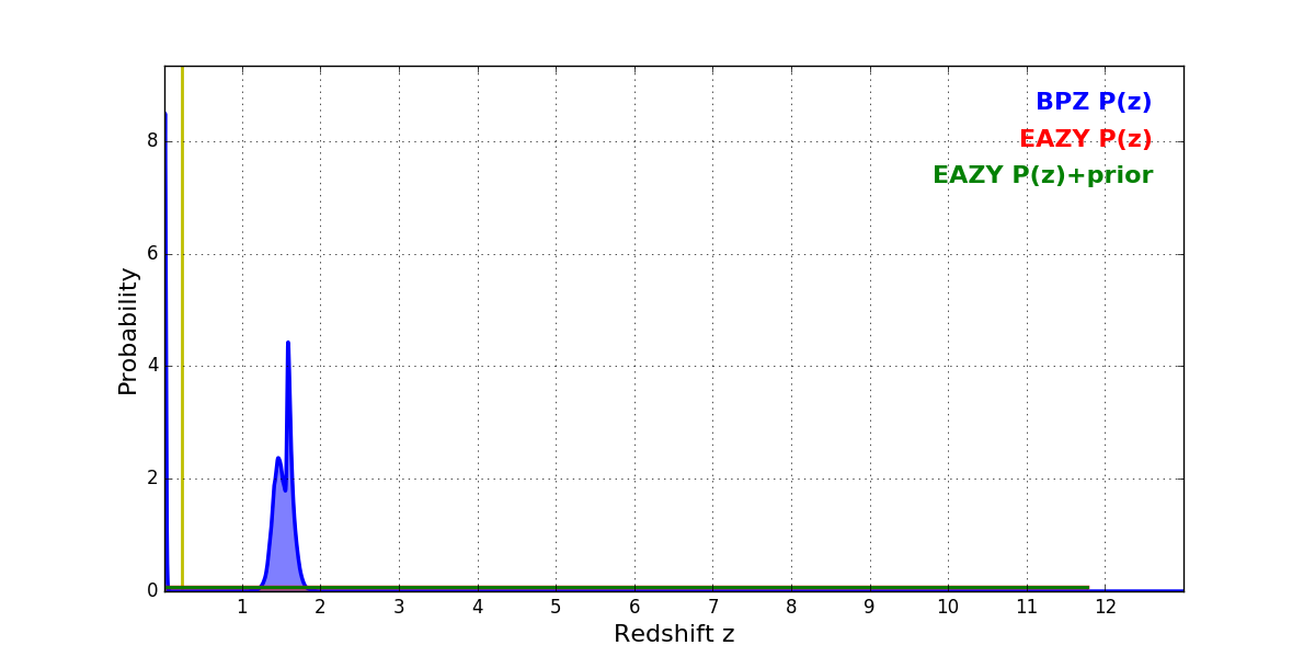 In P(z) plots: Yellow lines mark the cluster redshift z = 0.228,