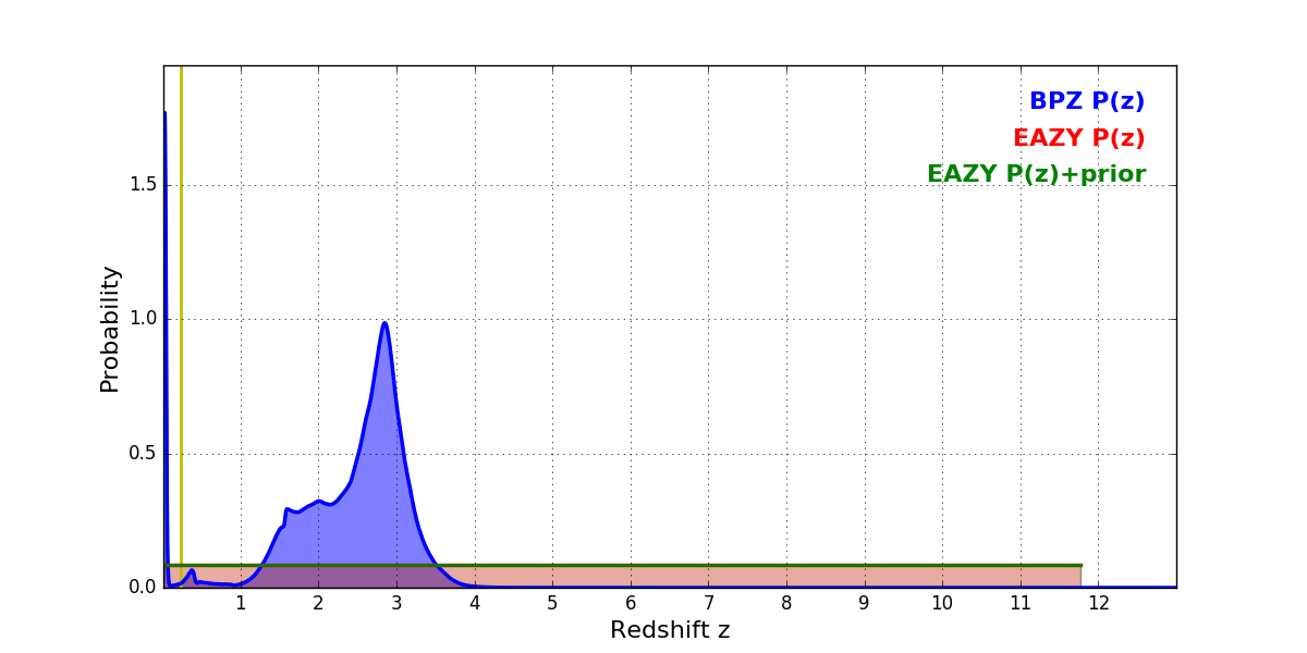 In P(z) plots: Yellow lines mark the cluster redshift z = 0.228,