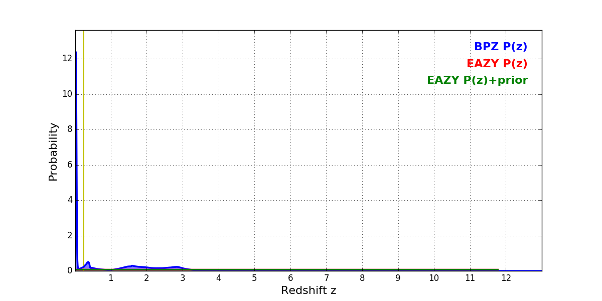 In P(z) plots: Yellow lines mark the cluster redshift z = 0.228,