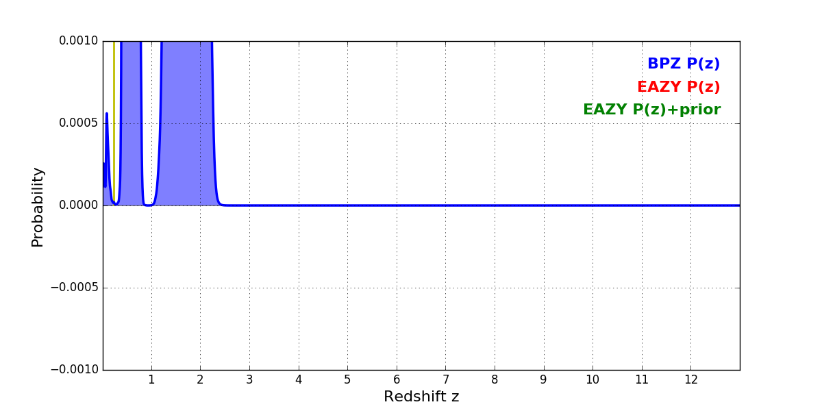 In P(z) plots: Yellow lines mark the cluster redshift z = 0.228,