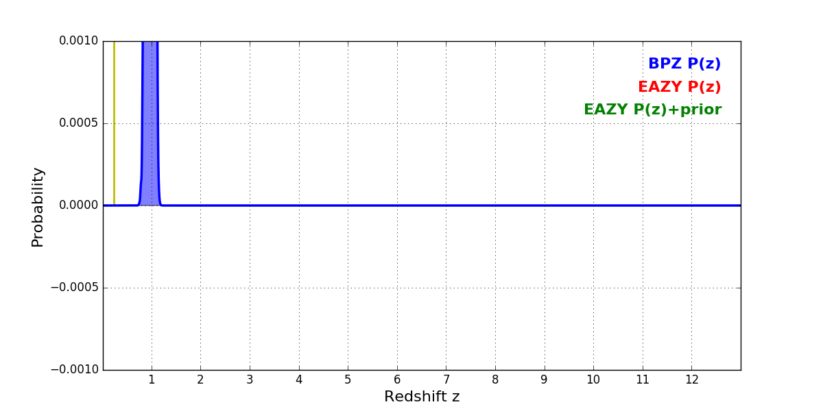 In P(z) plots: Yellow lines mark the cluster redshift z = 0.228,