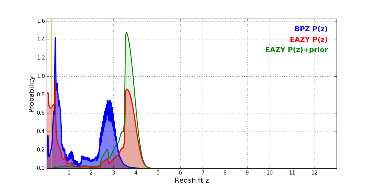 In P(z) plots: Yellow lines mark the cluster redshift z = 0.228,