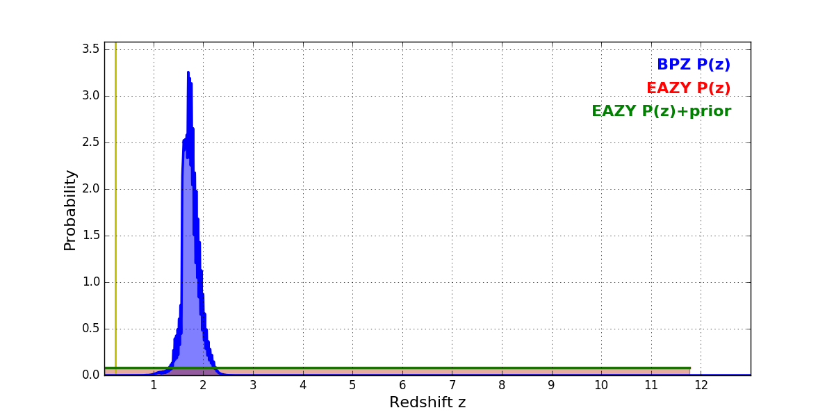 In P(z) plots: Yellow lines mark the cluster redshift z = 0.228,
