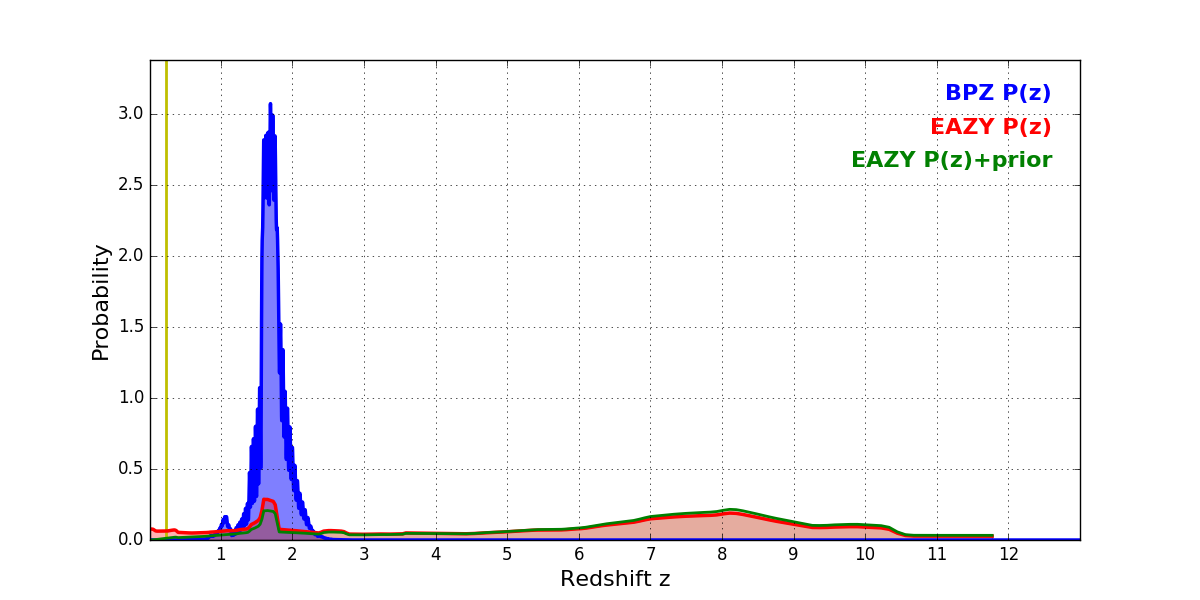 In P(z) plots: Yellow lines mark the cluster redshift z = 0.228,