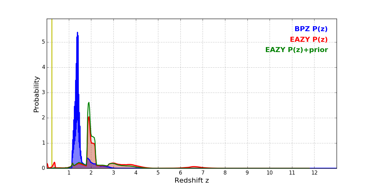 In P(z) plots: Yellow lines mark the cluster redshift z = 0.228,