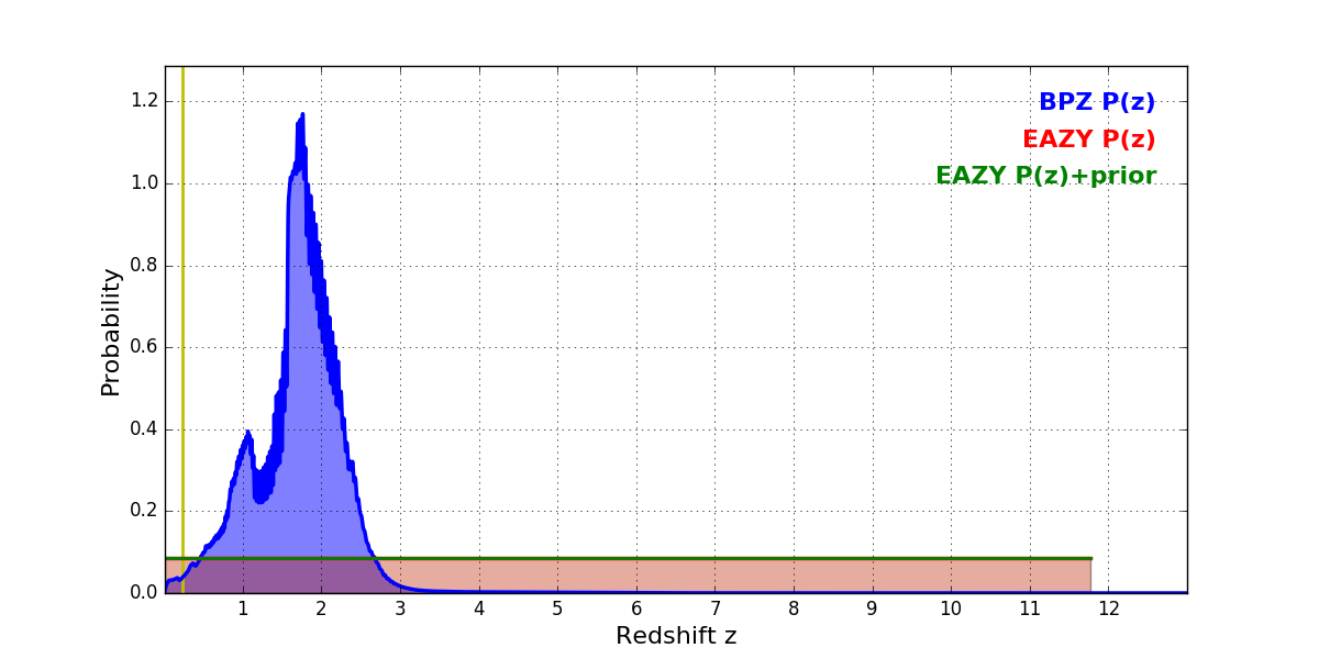 In P(z) plots: Yellow lines mark the cluster redshift z = 0.228,