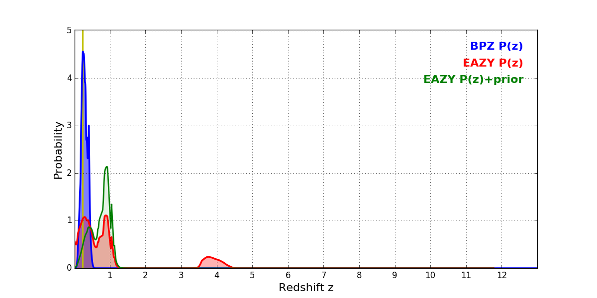 In P(z) plots: Yellow lines mark the cluster redshift z = 0.228,