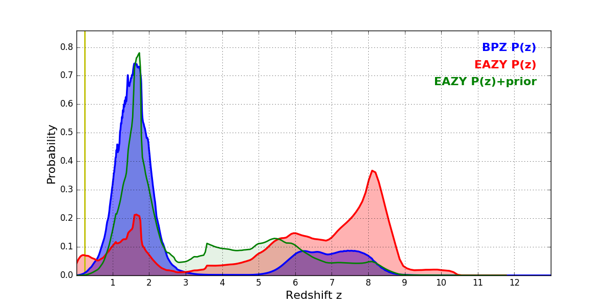 In P(z) plots: Yellow lines mark the cluster redshift z = 0.228,