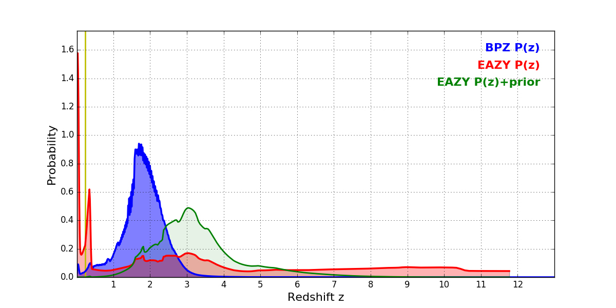 In P(z) plots: Yellow lines mark the cluster redshift z = 0.228,
