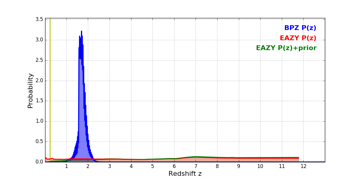 In P(z) plots: Yellow lines mark the cluster redshift z = 0.228,