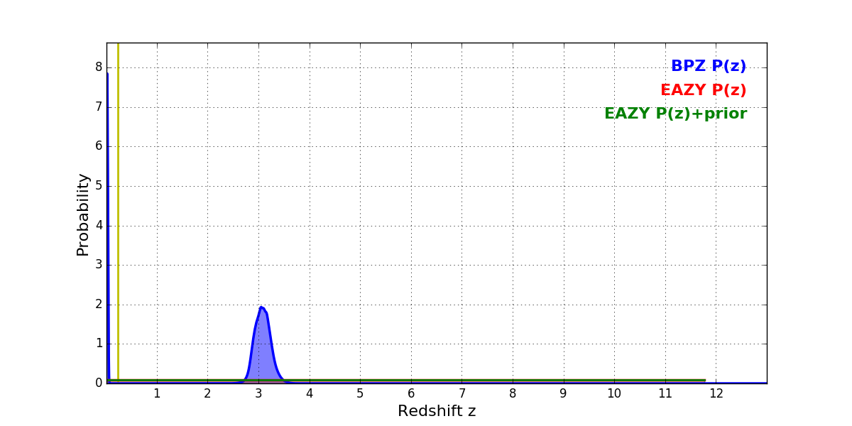 In P(z) plots: Yellow lines mark the cluster redshift z = 0.228,