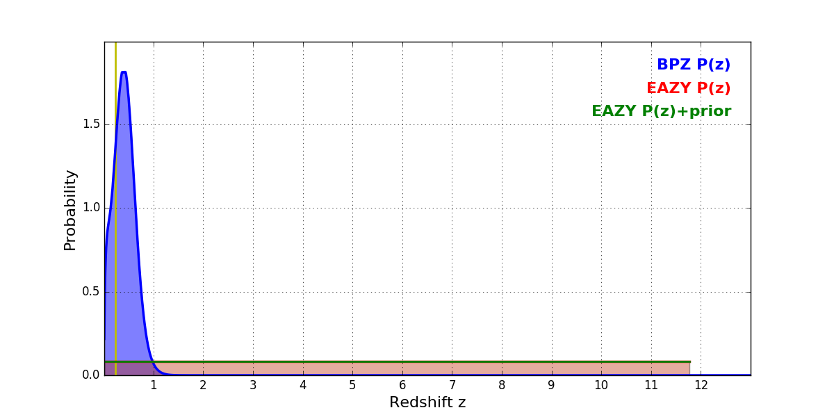 In P(z) plots: Yellow lines mark the cluster redshift z = 0.228,