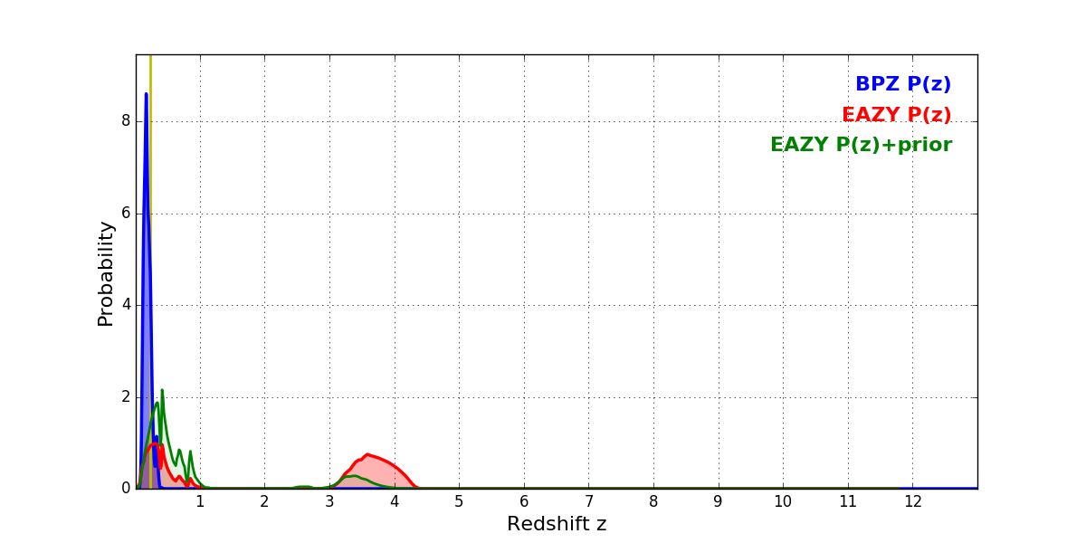 In P(z) plots: Yellow lines mark the cluster redshift z = 0.228,
