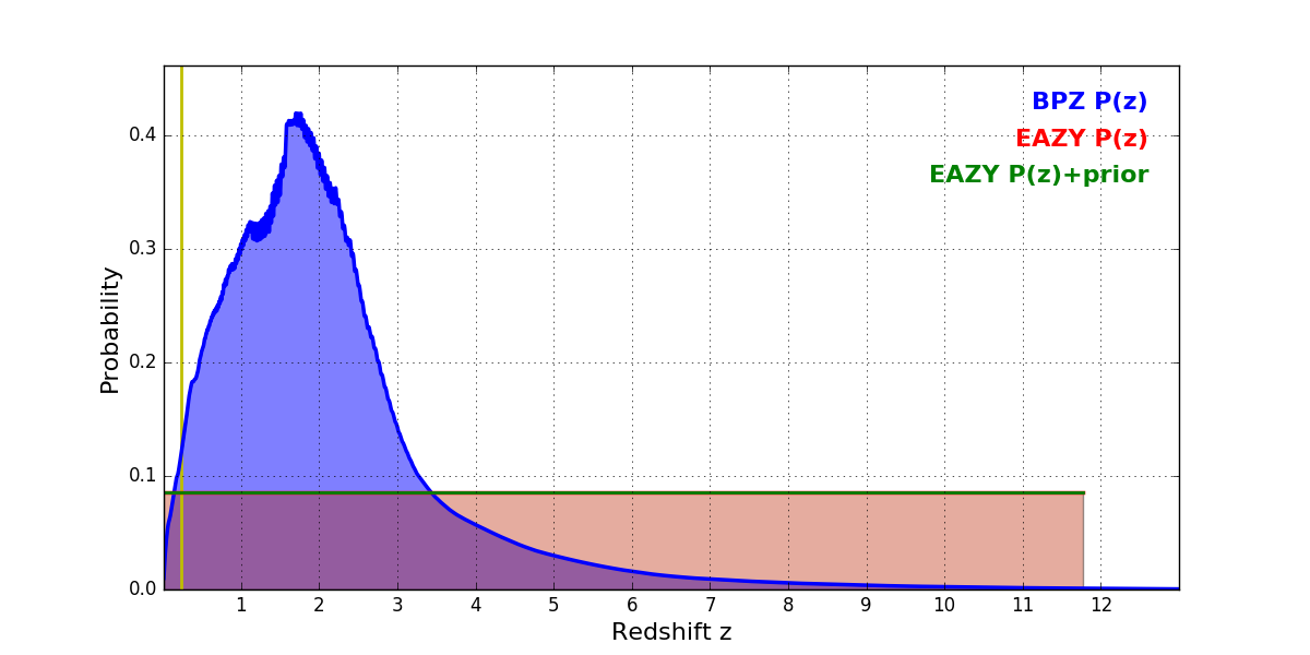 In P(z) plots: Yellow lines mark the cluster redshift z = 0.228,