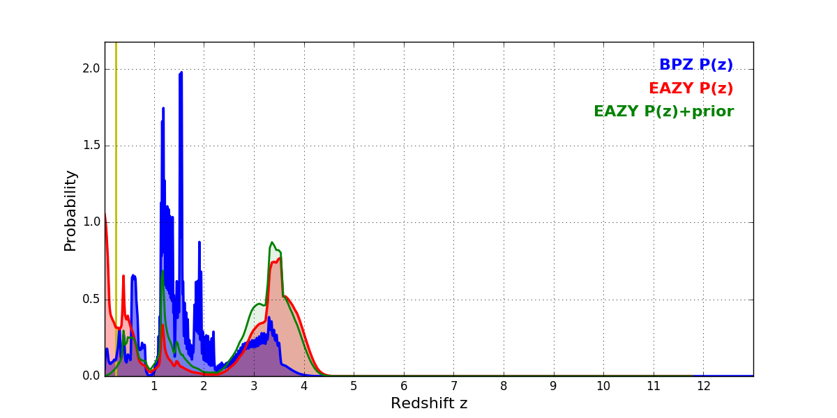 In P(z) plots: Yellow lines mark the cluster redshift z = 0.228,