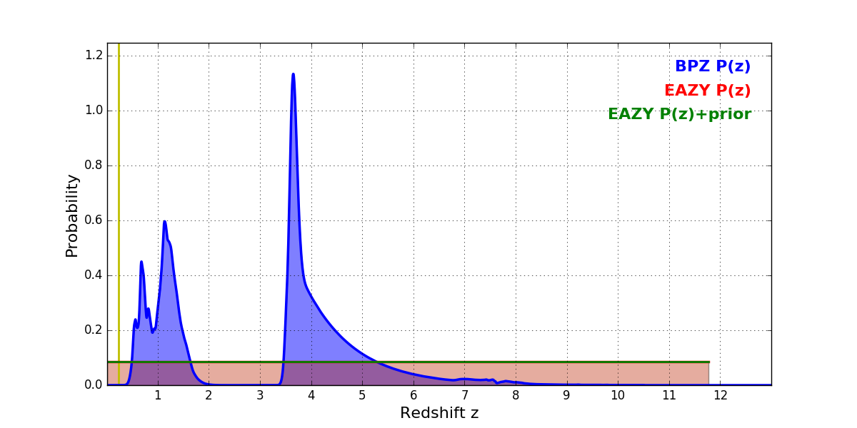 In P(z) plots: Yellow lines mark the cluster redshift z = 0.228,