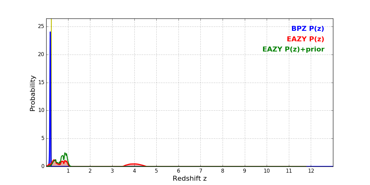 In P(z) plots: Yellow lines mark the cluster redshift z = 0.228,