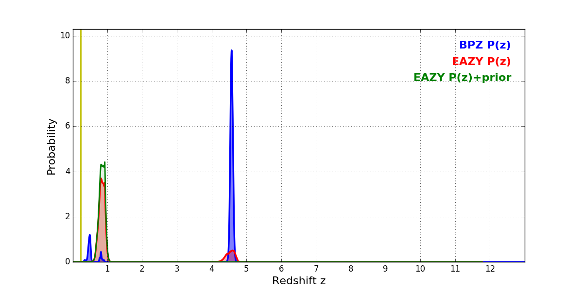 In P(z) plots: Yellow lines mark the cluster redshift z = 0.228,