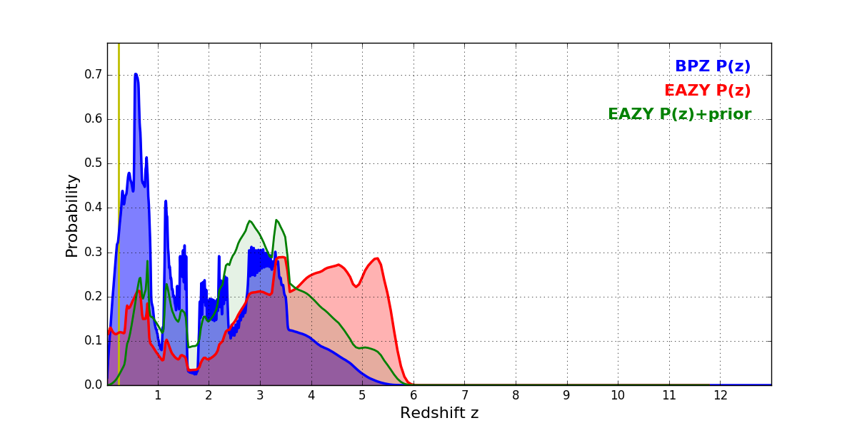 In P(z) plots: Yellow lines mark the cluster redshift z = 0.228,