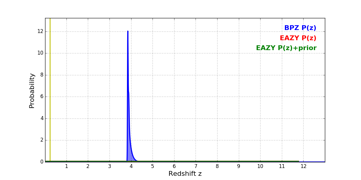 In P(z) plots: Yellow lines mark the cluster redshift z = 0.228,