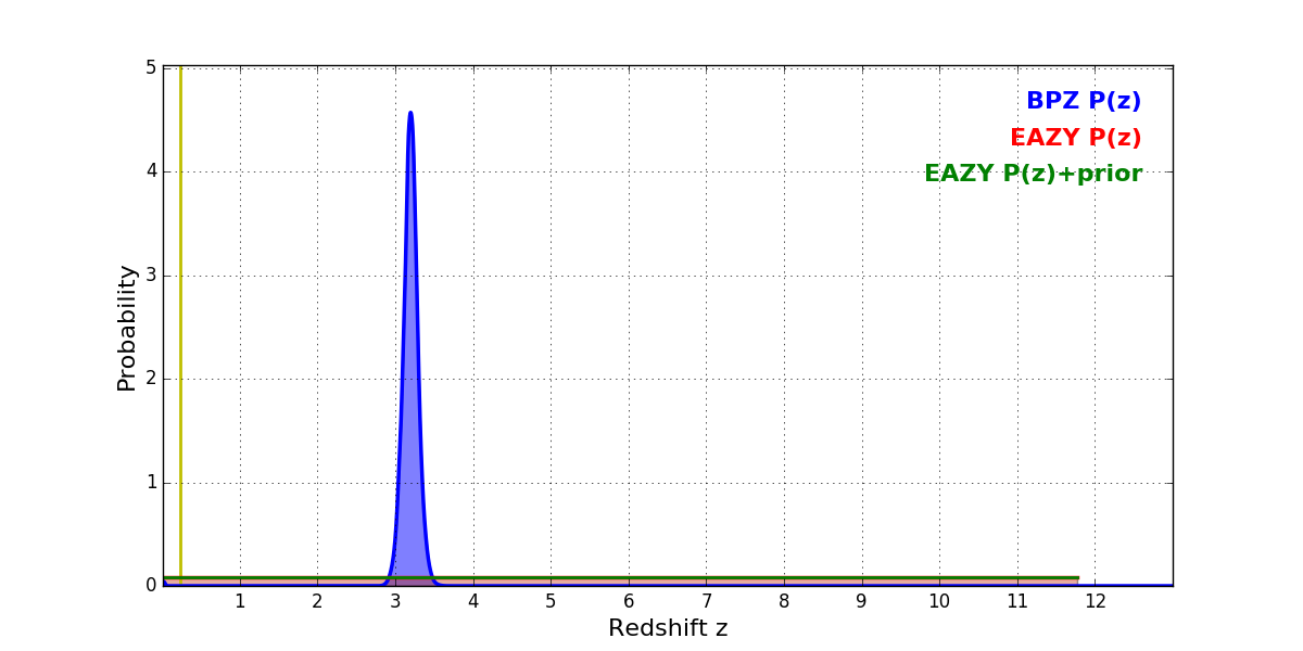 In P(z) plots: Yellow lines mark the cluster redshift z = 0.228,
