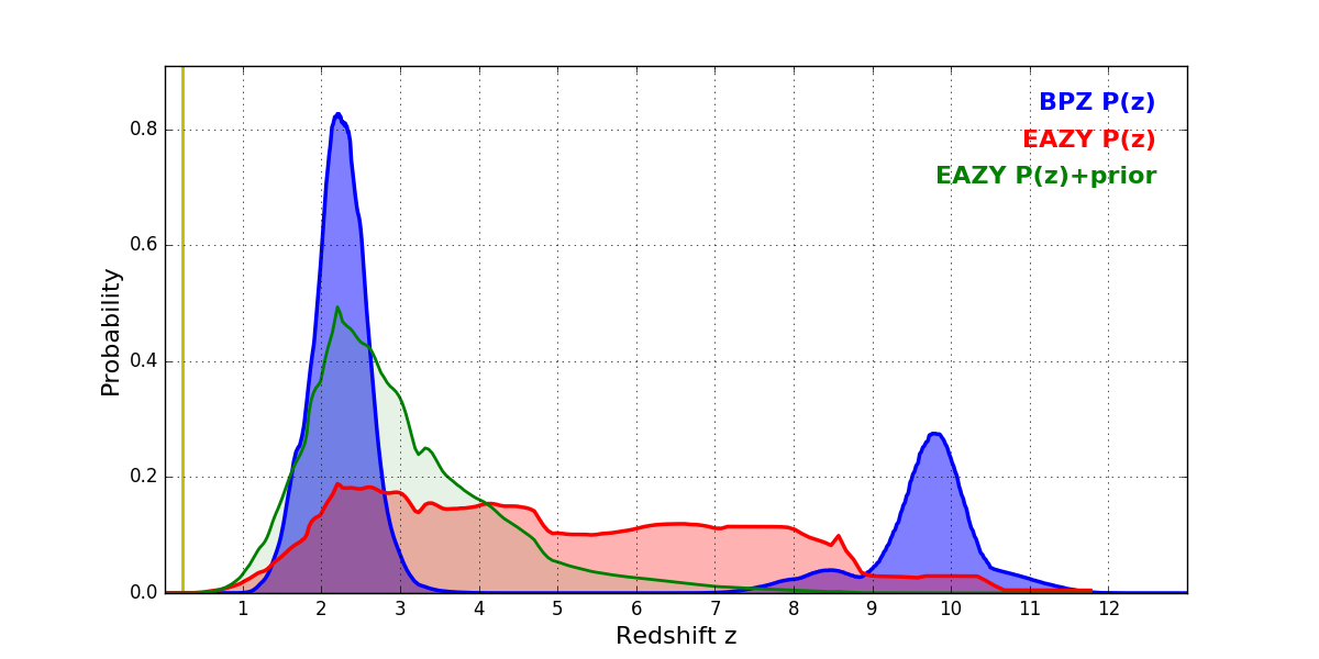 In P(z) plots: Yellow lines mark the cluster redshift z = 0.228,