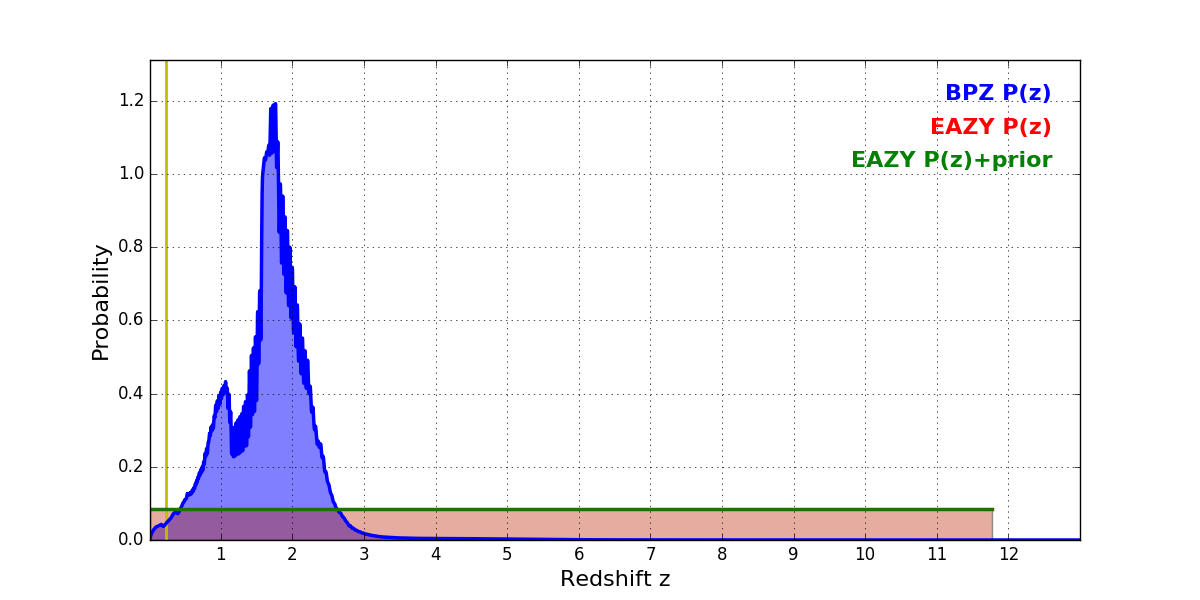In P(z) plots: Yellow lines mark the cluster redshift z = 0.228,