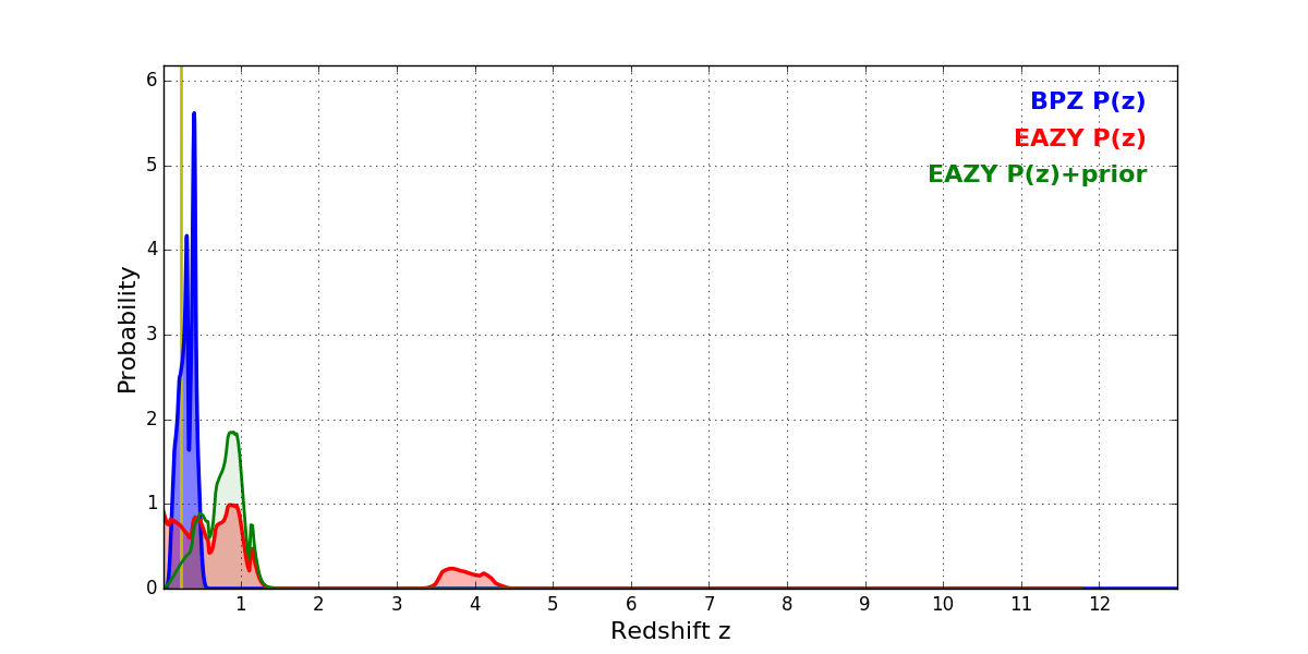 In P(z) plots: Yellow lines mark the cluster redshift z = 0.228,